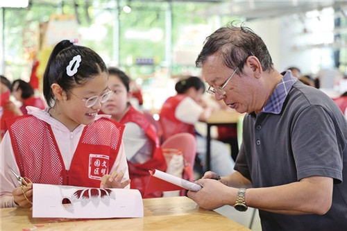 8月6日,在园区新时代文明实践小小志愿者主题夏令营里,小朋友们跟着剪纸名家金国荣学剪纸,感受传统文化魅力。(杨玉英 摄)