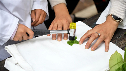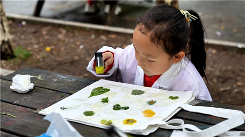 在家长的指导下,孩子们纷纷拿出自己采集到的中草药,并展示自己收获的知识和中药。随后,他们整理挑选,浸泡固色,贴纸固定,现场响起了叮叮当当的敲击声,这是小朋友们在认真仔细地做自己的中药包。